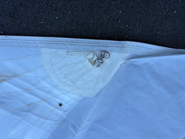 Doppeltes K5-Tauwerk mit Ösen, Schnappschäkel an der Talje, Stahlring mit Stange am Schothorn.