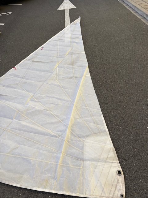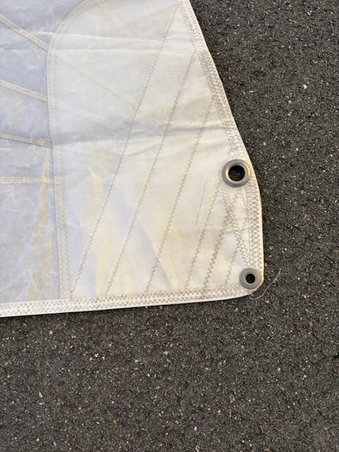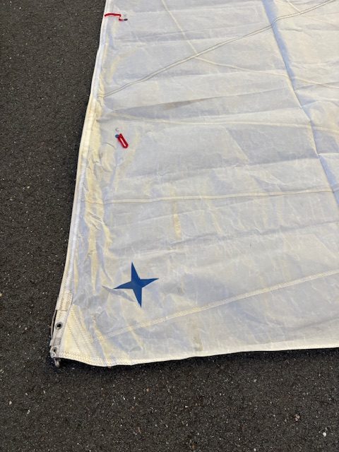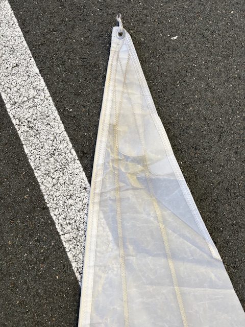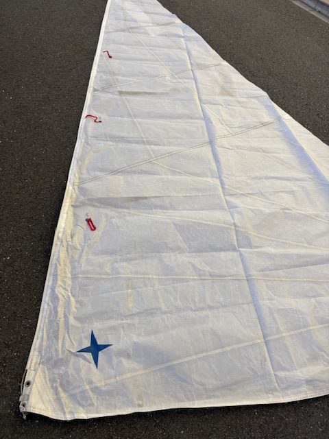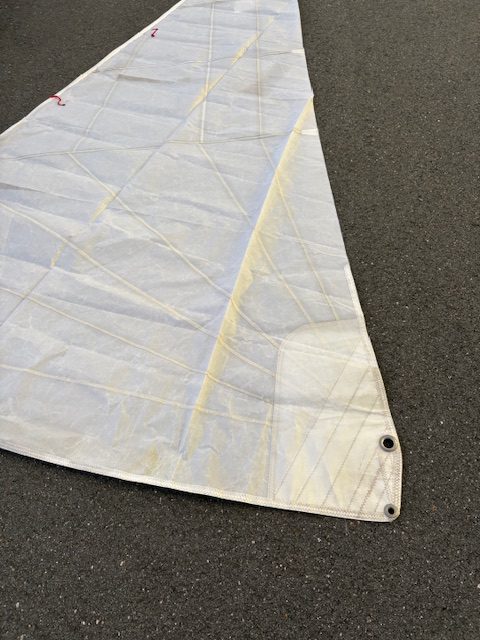 Unbenutzter Dacron Fock mit rostfreiem Draht und Haken; 2 Ösen für Schoten; ursprünglich für einen Sharpie