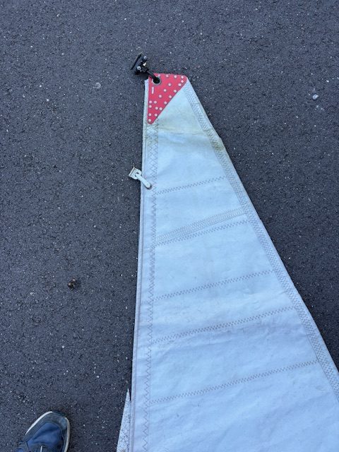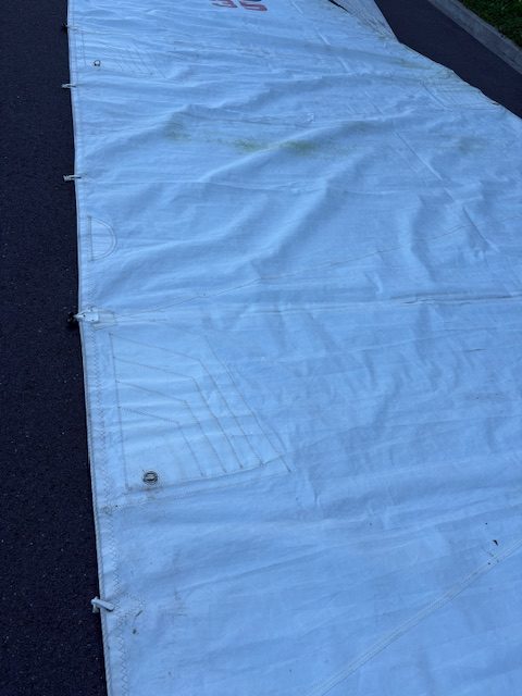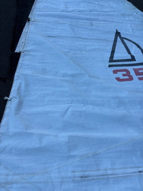 Vela mayor de dacrón de buena calidad que necesita lavarse; sables completos; carros de sables fijados; 3 rizos; ex Dehler 35