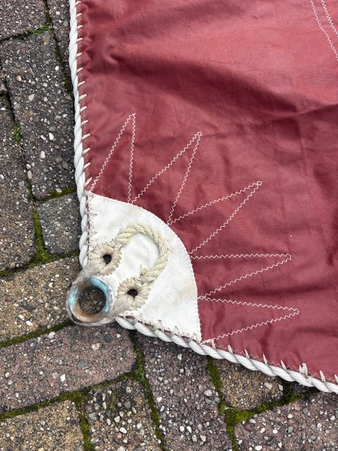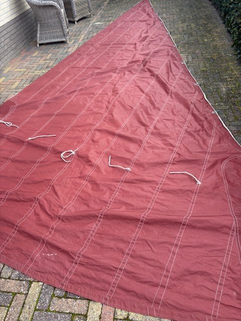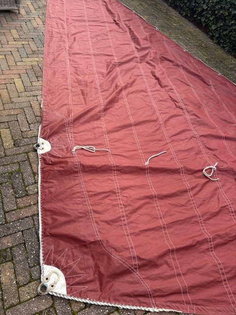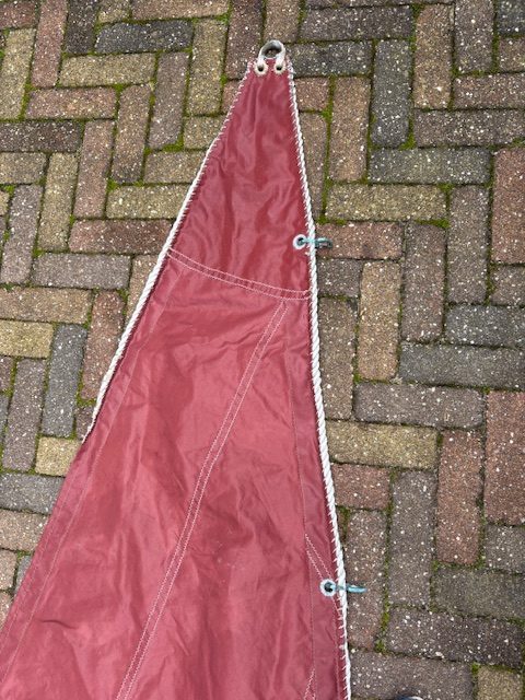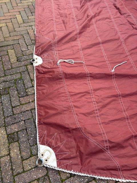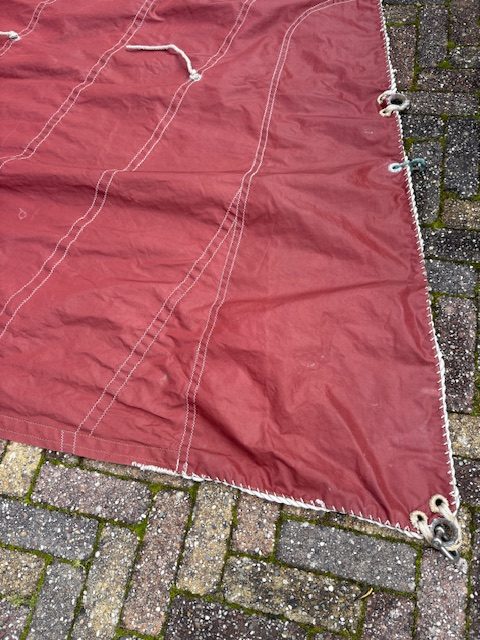 Very good quality Tanbark Dacron Jib with hooks, reef 90cm above the tack; sails has traditional finishing with sewn in eyes at clew, tack; top and reef; has probably never been used; ex steel 8m sloop
